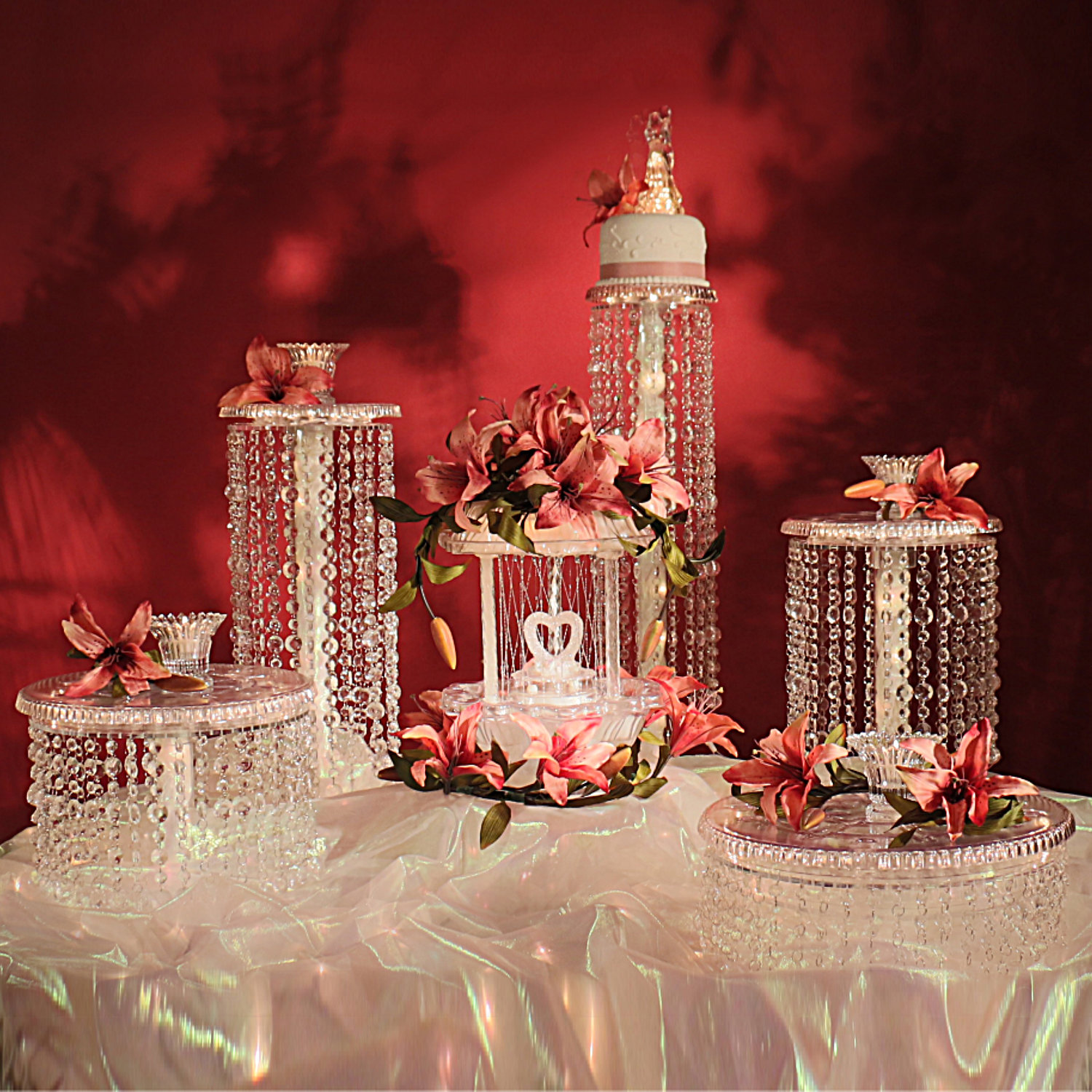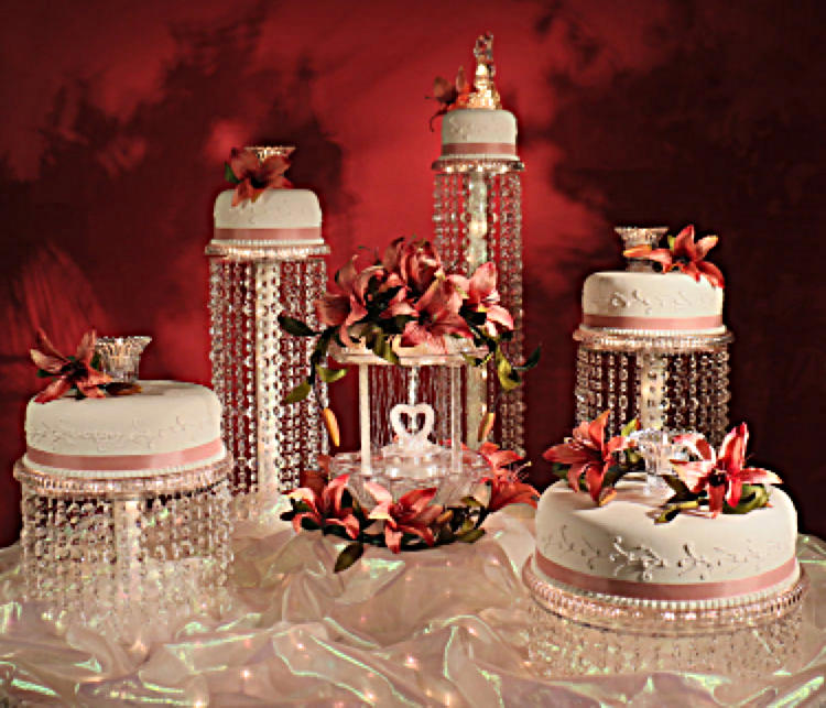 A five tier wedding cake within our Chandelier Collection, designed for 238 guests. Shown here on individual pillars, with our Crystal Carmen Oil Fountain, votive cups, and glass topper figurine. Custom variations available, to reach your approx. number of guests, and style of your wedding.