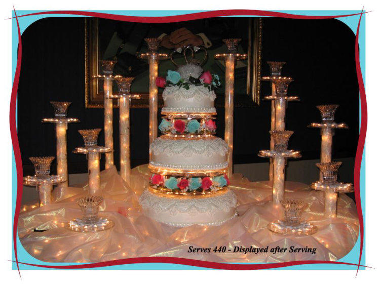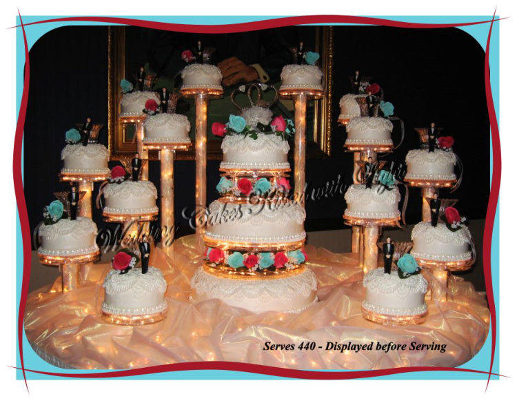 The Quinceañera is celebrated on a young Hispanic girl’s 15th birthday. The festivities can be as big as a wedding. This cake represents 14 cakes for 14 years with7 Damas (girls) on one side and 7 Chamberlanes (boys) on the other. The center, the Quinceañera, is the sweet 15 cake for the girl of honor.